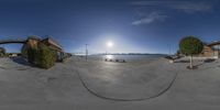 A modern architectural marvel in Lisbon, Portugal. This coastal city is known for its vibrant city life and stunning waterfront. The fisheye lens captures the essence of the city, with benches and the sun in the background.