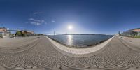 A stunning urban landscape in Lisbon, Portugal. The modern architecture and coastal setting create a unique atmosphere. The clear sky reflects in the water, casting a beautiful reflection of the buildings and bridge. A perfect day to explore the city.