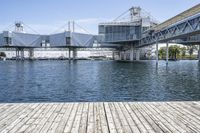 This is an image of a modern architecture building located in Toronto, Ontario, Canada. The building is situated near the coastal area, with the ocean and river visible in the background. The clear sky overhead complements the urban design of the city. A suspension bridge and boardwalk can be seen, emphasizing the city's connection to its water resources. The image captures the vibrant city life of Toronto, with its harbor, jetty, and pier. The surface of the asphalt reflects the day's sunlight, adding to the overall aesthetic of the scene.