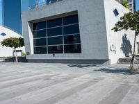 This is an image of a skateboarder riding past a concrete building with lots of windows on the outside in Kaohsiung, Taiwan. The clear sky and coastal location make it a perfect spot for urban design. The city's rivers and harbor can be seen in the background, reflecting the urban development of the area. The surface of the river and ocean contrast with the dirt and gravel that make up the surrounding landscape. This photo captures a typical day in the vibrant city of Kaohsiung, Republic of China.