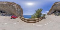 A car parked near a giant stone structure on the coastal cliffs of Mallorca, Balearic Islands. The clear sky and open space highlight the natural beauty of this European landscape.