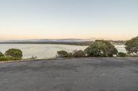 A breathtaking view at dawn overlooking a coastal cliff and the open ocean. The clear sky reflects on the water, creating a serene landscape. Trees and vegetation line the road, providing a picturesque perspective of nature's beauty.