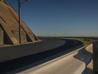 A coastal road at dawn, with clear skies and a hard shadow from a street light. The road curves along the ocean, lined by trees and Armco barriers. The asphalt road surface reflects the beauty of nature and water.