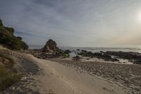 Coastal Dawn: A Serene Sandy Beach with Rocky Terrain
