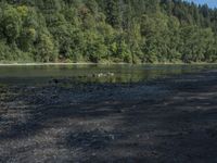 This image captures a scenic coastal landscape with a body of water and trees on the bank. A dog stands near the water, providing a sense of scale and adding an element of interest to the scene. The beach is composed of sand and gravel, with riparian vegetation and grass growing along the shore. In the distance, the mountains and hills create a dramatic backdrop against the clear sky dotted with clouds. The photo represents a peaceful day by the ocean, with the dog enjoying the open space and natural beauty.