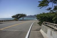 The Pacific Coast Highway in California winds along the stunning coastal landscape, framed by towering trees. An empty road beckons, bordered by guardrails and the sparkling ocean. A picturesque day in California.