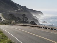 a motorcycle is traveling down the highway on the coast highway near the ocean and cliffs