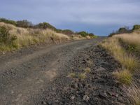 A dirt road winding up a coastal hill, surrounded by lush grass and vegetation. The ocean sparkles in the distance, against a backdrop of cloudy skies. A perfect spot for recreational activities in nature.