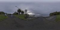 A gloomy day at a coastal intersection. Grey sky looms over a concrete road, with a body of water in the background. The landscape is lined with vegetation and trees, creating a serene and rural atmosphere.