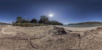 a panoramic view of the sun over sand and trees on the shore of a lake