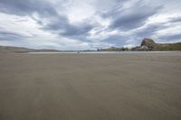 a picture of a beach with some very big rocks in the background, under a cloudy sky