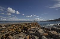 A serene coastal landscape featuring a rocky beach with waves crashing against the bedrock cliffs. The clouds create a dramatic horizon. A perfect day for nature and recreational activities by the ocean.