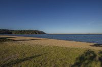 A tranquil coastal landscape with a clear sky reflecting on the calm ocean surface. The sandy beach and grassy shore provide open spaces for recreation and relaxation. Nature's beauty and the water resources are showcased in this serene scene.
