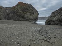This stunning stock photo captures the beauty of a coastal landscape at dawn in California, USA. The image features three big rocks in the sand with waves coming in through them, creating a mesmerizing view on a beach next to the ocean. The scene is set against a backdrop of mountains, open space, and the gloomy grey sky, adding a touch of mystique to the image. The foggy atmosphere enhances the overall ambiance, making it a perfect representation of the serene beauty of California's coastline.