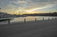 A beautiful coastal landscape at dawn. The afterglow reflects on the calm water, creating a serene atmosphere. A road leads to a recreational pier and restaurant. Perfect for a peaceful morning walk.