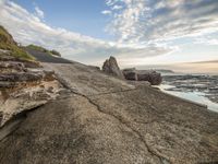 Coastal landscape at dawn, with large rocks along the shore as the sun rises. Low clouds create a scenic backdrop. This nature-filled highland terrain is perfect for recreational activities.