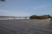 This image captures a calm and serene natural environment. The wooden boardwalk stretches across the area, providing a path for recreation and leisurely walks. The boardwalk is surrounded by a beautiful landscape, with the lake and ocean on one side and the wood floor on the other. As the sun rises at dawn, the horizon is filled with a breathtaking view of the open space and clouds. This photo represents the perfect setting for a peaceful and rejuvenating getaway in a coastal region.