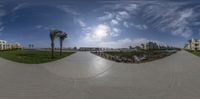 A modern residential area in Egypt, featuring straight roads lined with palm trees. Coastal landscape with ocean views and a mix of modern and traditional architecture. Concrete streets lead to a beach overlooking the ocean.