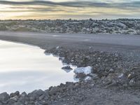 Rugged coastal landscape of Iceland's lagoon at sunset. A person walks along the shore, passing by a bench overlooking the serene body of water. Contrails streak across the European sky.