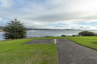 A scenic view of a coastal landscape with a lake surrounded by highlands. Lush vegetation and trees cover the land lot. The clear blue sky and calm ocean surface create a serene and natural atmosphere.