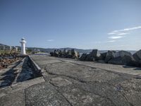 A picturesque coastal landscape featuring a lighthouse perched on rocky terrain. Majestic mountains and blue skies create a stunning backdrop. The concrete road leads to a pier where recreational activities take place.