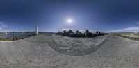 A wide-angle fish-eye view of a coastal landscape. The concrete road leads to a towering lighthouse on the shore. The azure ocean and rocky pier create a picturesque winter scene.