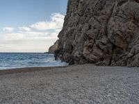 Coastal landscape of Majorca, Spain. Rocky walls overlook the open space towards the ocean. Gravel and dirt surfaces blend into the natural beauty of the Balearic Islands. Clear day with clouds adding a dramatic effect.