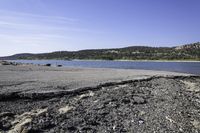 a rocky shore along a lake with mountains in the distance, with dirt and rocks strewn on the beach