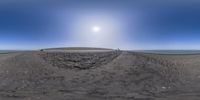 A serene coastal landscape in the Netherlands. Cobblestone paths wind through open grassy plains, leading to the azure ocean shore. Trees dot the horizon, creating a peaceful natural environment. People riding skateboards enjoy the calm beach and the clear sky above.