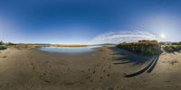 A tranquil coastal landscape in New Zealand, with low sand dunes leading to the calm ocean. The open space and elevated horizon create a sense of natural serenity. A perfect destination for recreational activities.