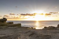 Breathtaking coastal landscape at dawn, overlooking the ocean from a rocky cliff. The sun's rays illuminate the sky, casting a warm golden glow on the water. A tranquil scene of natural beauty.