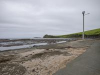A sandy path leading to the ocean, lined with rocks and with grass in the background. Open space and coastal landscape create a serene and peaceful atmosphere. Grey skies add a touch of gloom.