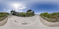 A scenic mountain road in California, lined with trees and steps. The low coastal landscape offers a stunning view of the ocean. Clear skies and lush vegetation create a serene atmosphere.