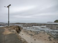 A gloomy coastal landscape with waves crashing onto the sandy shore. Street lights along the wet gravel road create an eerie atmosphere. The grey sky and open space add to the desolate nature of the scene.