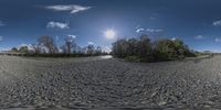 Panoramic view of coastal land and water, with the sun shining through the sky. Open space and vegetation create a scenic landscape. Dirt and asphalt roads lead to the river and ocean.
