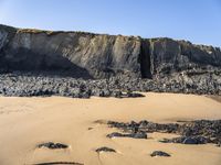 A breathtaking coastal landscape in Portugal. The open space, with its sandy beach and clear blue waters, is nestled between majestic mountains. The rocky outcrops and bedrock formations add to the beauty of this natural terrain.