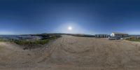 A coastal landscape in Portugal with a view of the ocean and a sandy beach. A dirt road leads to a building with a grassy facade. The clear sky and open space create a serene natural environment.