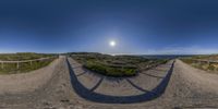 A coastal landscape in Portugal, featuring a sandy path leading straight down to the ocean. The clear blue sky and sunlight create a serene atmosphere. The sand dunes and vegetation add to the natural beauty of the scene.