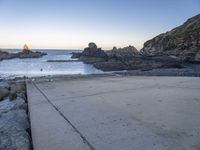 This photo captures a beautiful coastal landscape in Portugal, Europe. The clear sky at dawn provides a stunning backdrop to the ocean waves crashing against the shore. In the foreground, there is a skateboard on a paved area near the water, creating a sense of adventure and leisure. The concrete boat ramp and highway ramp signify the entry and exit points to this picturesque coastal area. The incline of the terrain adds to the natural beauty of the scene. This image represents the perfect blend of nature and infrastructure in Portugal.