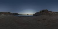 A breathtaking view of a coastal landscape in Portugal during sunset. The beach is surrounded by rocky formations, creating a dramatic and serene atmosphere. The clear sky showcases the vibrant colors of the setting sun.