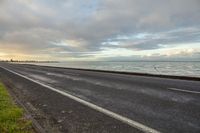 A coastal landscape at dawn with a road surface leading towards the ocean. Street lights illuminate the plain and the asphalt road. Clouds fill the sky, creating a serene and natural atmosphere for recreational water activities.