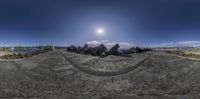 A coastal landscape with a rocky beach and a lighthouse tower in the background. Clouds cast hard shadows on the concrete road surface. The beach features unique rock sculptures, seemingly holding something out in the wind. A breathtaking winter day by the ocean.