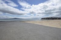 A coastal landscape with an open sandy beach and crashing waves. The shore remains dry as the tide recedes. Azure skies with cumulus clouds set the backdrop for a serene day at the beach.