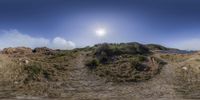 the sunny sun shines over the hillside by the water and sand shore near an ocean