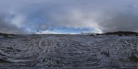 a large body of water that is very rough looking and full of foam, a couple dark clouds above