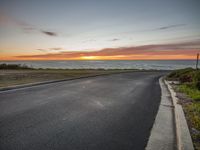 A serene coastal landscape at dawn, with the sun visible on the horizon casting a warm afterglow. The road surface gleams in the sunlight, leading to the ocean. Perfect for recreational activities and enjoying the sunny weather.