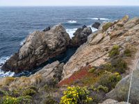 A captivating coastal landscape in the USA, showcasing rock cliff formations adorned with colorful vegetation. The picturesque beach offers stunning views of the Pacific Ocean, with a gloomy grey sky as the backdrop.