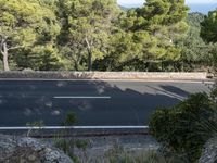An elevated road in Mallorca, Spain, offers a high view of the coastal landscape. The asphalt surface contrasts with the open spaces and dirt paths. The clear day showcases the beautiful nature and ocean views of the Balearic Islands.