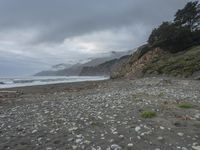 a rocky beach with lots of stones on the shore and in the background, mountains and a fog