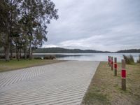 A gloomy day at a coastal park by the lake. Grey skies and gloomy atmosphere reflect on the calm water. Picnic area with benches and trees provide recreational spaces at the water's edge.
